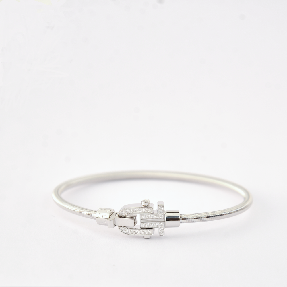 這款手鐲融合瑞士高端工藝與極簡設計美學,以流暢曲線及精緻細節呈現優雅時尚。採用頂級金屬材質,耐用且舒適,適合日常佩戴及特別場合。獨特設計使手鐲成為展現個人品味和自信態度的理想配飾,也是送禮的精選之作。 現在就選擇這款經典手鐲,提升您的時尚魅力。 Diapason VIBES Bangle, Silver String, Silver Buckle 26 Diamonds Model no: VEYS-04-S1S12-0101