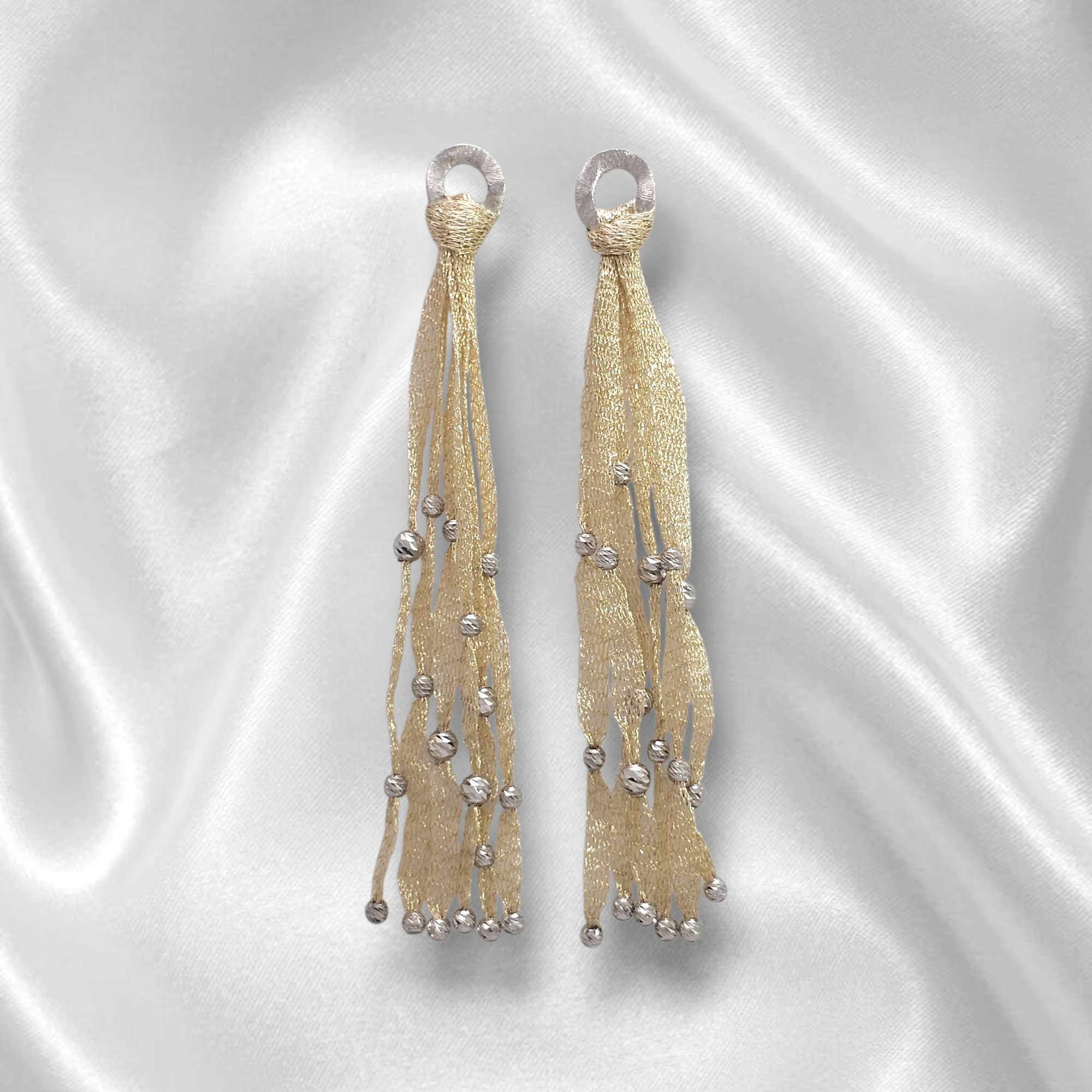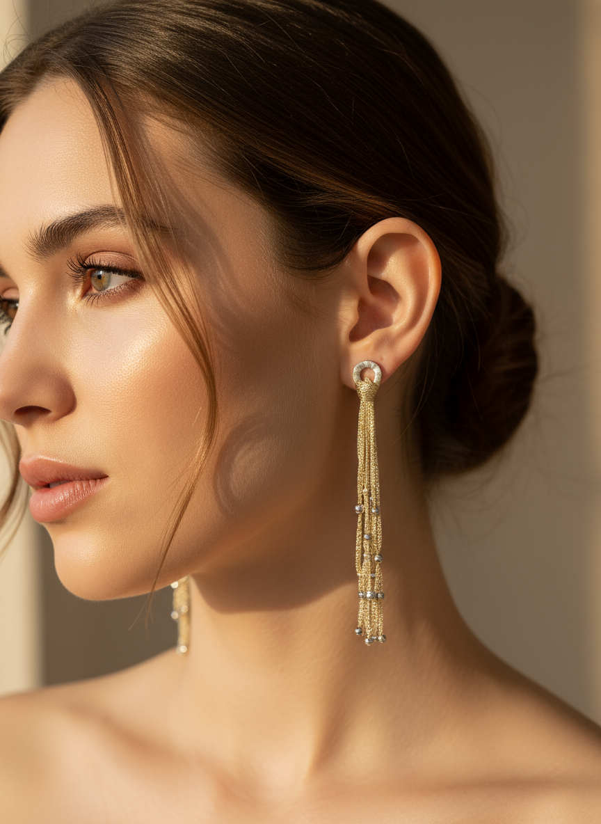 Cosmo系列象徵著女性如宇宙般深邃、自由與無限可能。OMG-1412-03-1GH-L耳環的設計靈感來自星體運行的軌跡與能量流動,Orietta Martin以金色流蘇象徵女性在生活中流動的情感與堅定的力量,鍍銠銀色則代表理性與現代感。