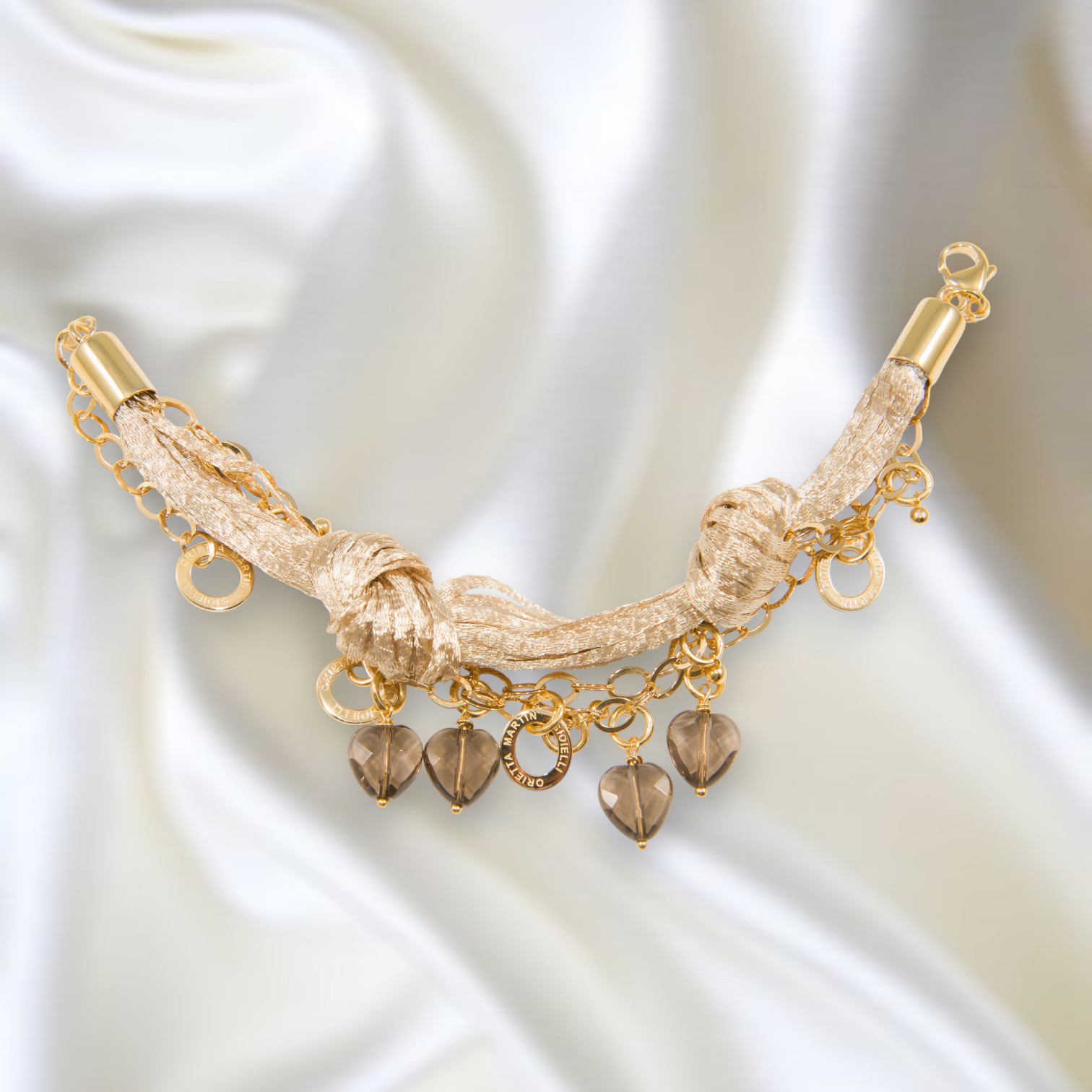 Cuoricini系列以「愛的語言」為設計主軸,OMG-1201-06-2A手鏈透過心形水晶與金屬線條的交織設計,象徵女性在生活中展現的柔美與堅定交融。煙燻色水晶如同情感的深度,在手腕間低語,傳遞出佩戴者的獨立態度與細膩情感。