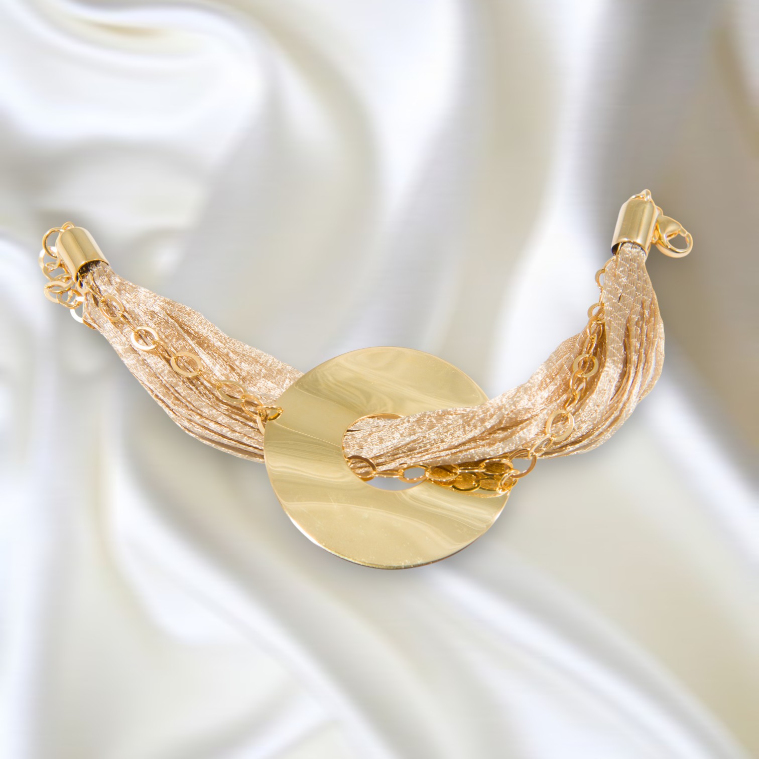 Giulia系列以「結構即美」為設計主軸,OMG-1207-06-0A手鏈透過鍍金銀鏈與金色銅絲的幾何交織設計,象徵女性在生活中展現的理性與感性交融。金屬線條如建築般堅定,在手腕間低語,傳遞出佩戴者的獨立態度與細膩情感。