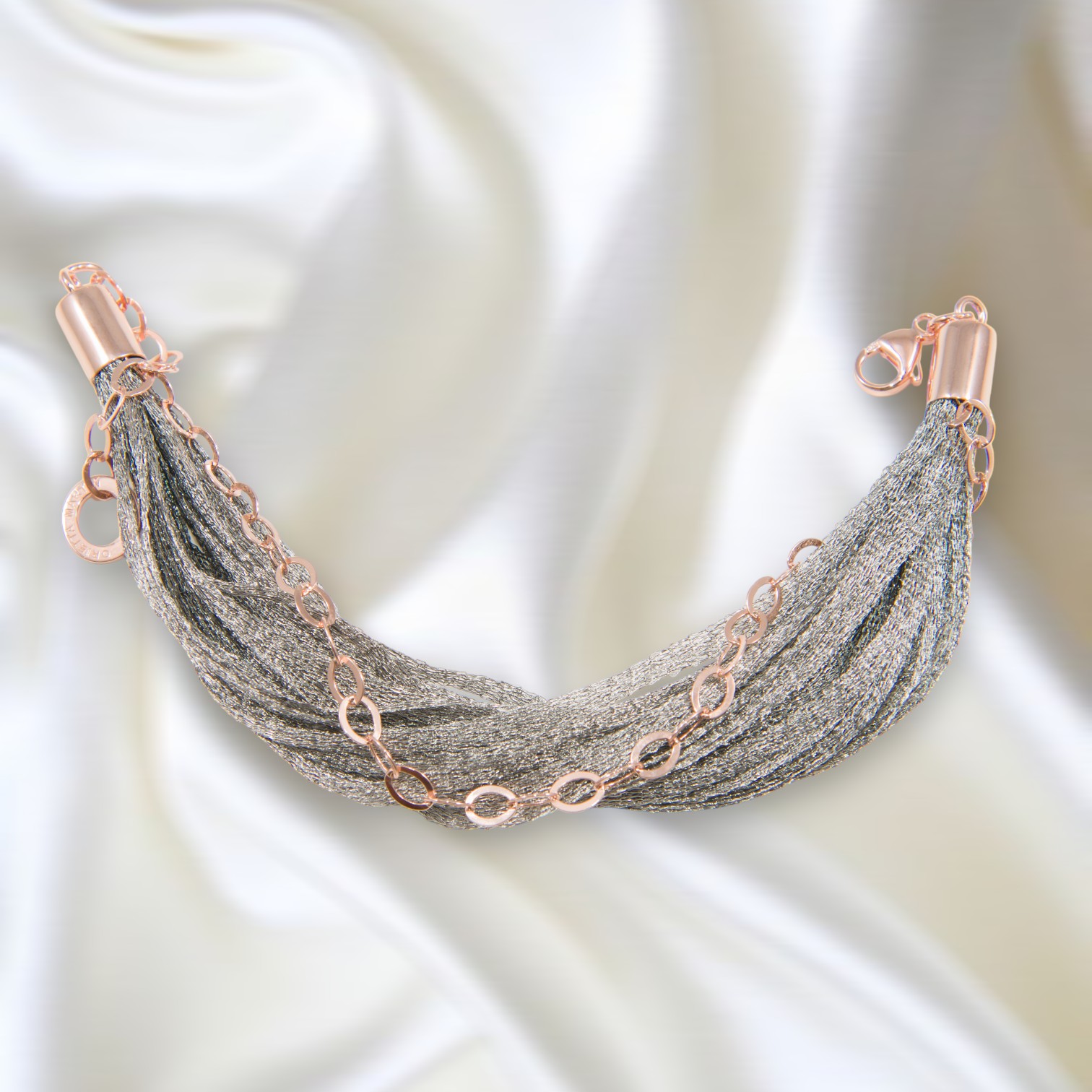Donna系列以「女性的力量」為設計主軸,OMG-1209-06-1B手鏈透過玫瑰金與銀色銅絲的交錯設計,象徵現代女性在生活中展現的堅定與柔美交融。金屬線條如意志般堅定,在手腕間低語,傳遞出佩戴者的獨立態度與細膩情感。