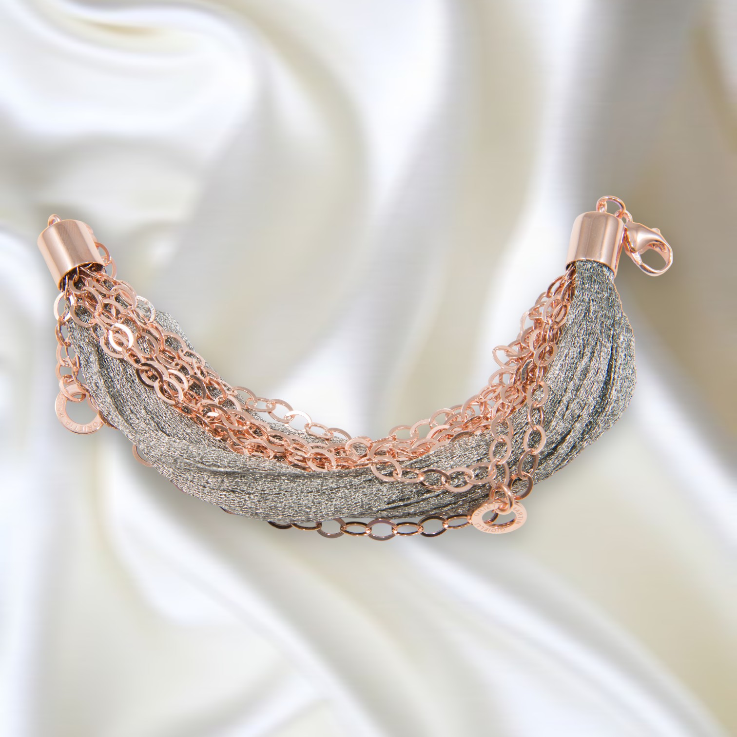 Donna系列以「女性的力量」為設計主軸,OMG-1209-06-2B手鏈透過玫瑰金與銀色銅絲的交錯設計,象徵現代女性在生活中展現的堅定與柔美交融。金屬線條如意志般堅定,在手腕間低語,傳遞出佩戴者的獨立態度與細膩情感。